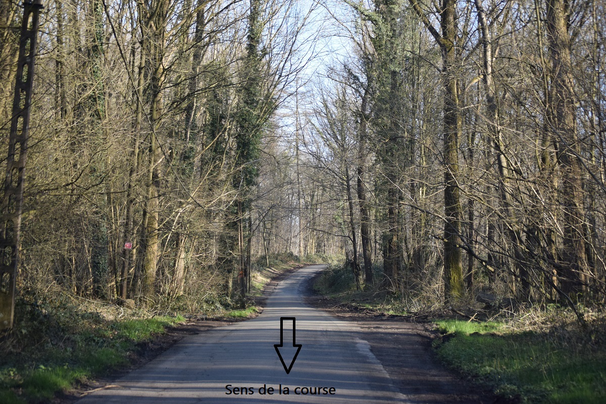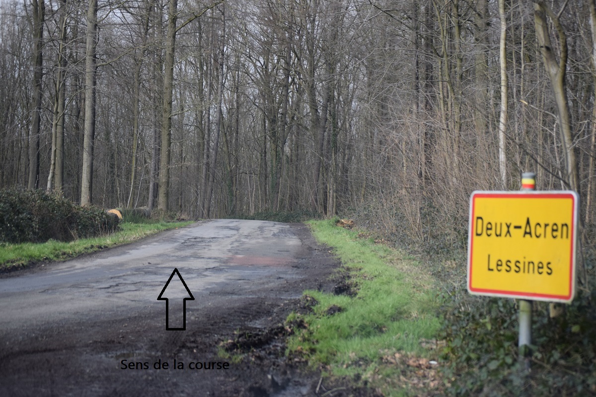 Dans la montée de la « FERME DU BUSE », la chaussée est large. Ensuite, les coureurs se retrouvent sur un tronçon plus étroit et sinueux. Le revêtement et les bas-côtés sont irréguliers (tarmacadam). Au-delà de la partie boisée, la route est constituée de dalles de béton. Descente vers Acren et passage face à l’habitation de Claudy CRIQUIELION.