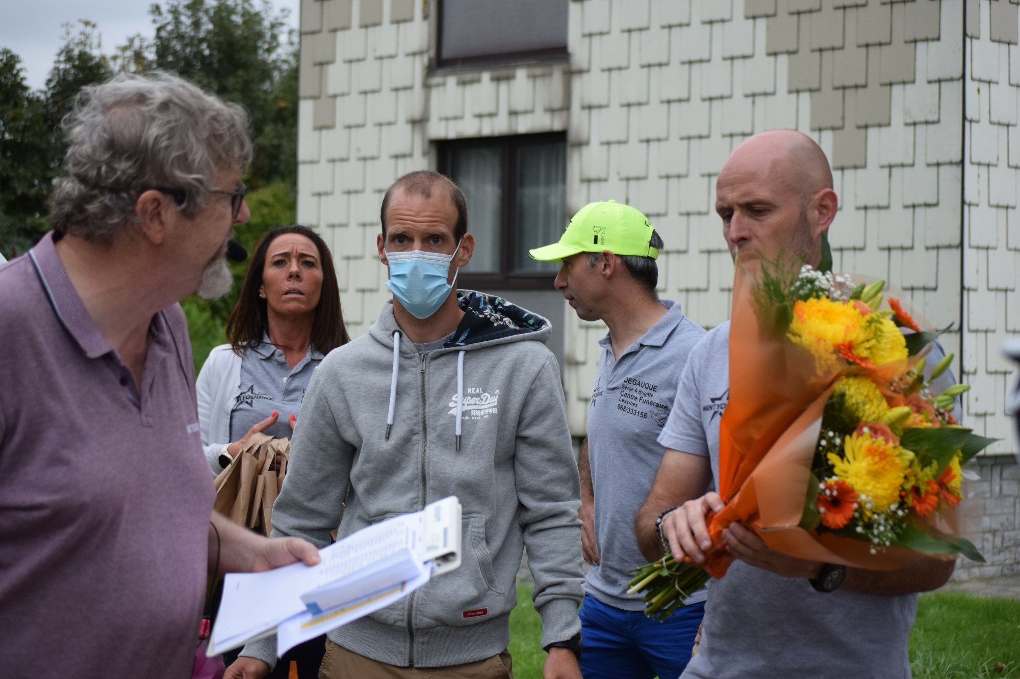 Photo. Des membres du comité + les deux anciens pros de Lessines : Thomas DEGAND et Grégory SCHOELENS. Avec Mr WILFART, speaker depuis l’an dernier.