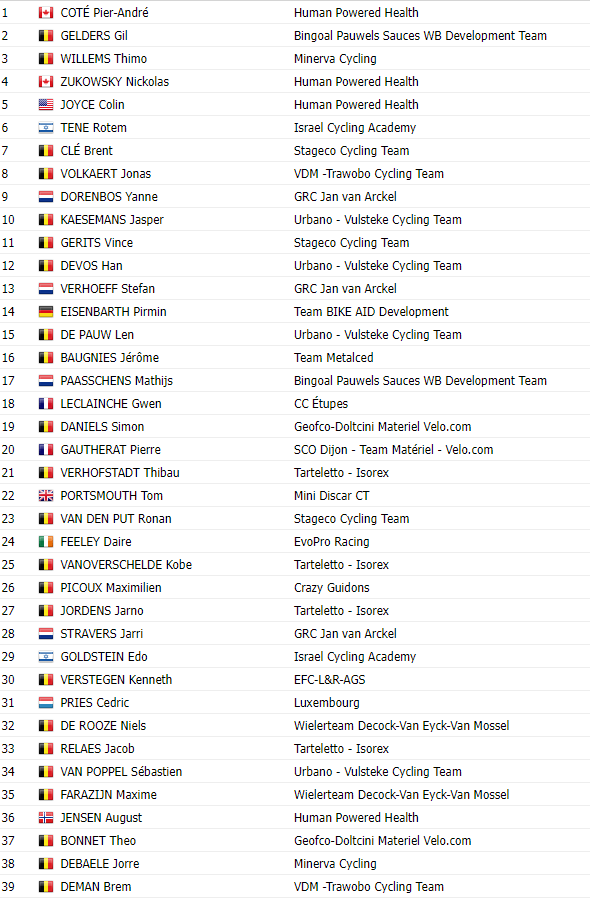 Le team « HUMAN POWERED HEALTH » les a tous eus à l’usure (et pas qu’un peu …) !!! Un véritable travail de sape durant toute l’épreuve. Quand le bon coup est parti à un peu plus de deux tours du terme, ils étaient six dont : COTE, JOYCE, ZUKOWSKI, WILLEMS, RENARD-HACQUIN et GELDERS. Dans la finale, ils perdent le français de la formation ETUPES. A la flamme du dernier kilomètre, WILLEMS met le turbo. Le coursier « MINERVA » avait de bonnes jambes. Alors que GELDERS de « BINGOAL PAUWELS WB DEVELOP » faisait grosse impression. Le surnombre a joué en faveur des boy’s. COTE n’a laissé aucune chance à GELDERS qui ne doit pas avoir de regrets. Tout bon !!! WILLEMS 3e démontre des qualités qu’il avait déjà lorsqu’il était chez « SPORT VL VLAANDEREN-BALOISE ». Globalement, la course fut animée. Pourtant, elle a mis du temps à se décanter. Sur plus de 180 bornes, il est certain que des pros ayant participé aux dernières classiques avaient plus de fond. Néanmoins, il est incontestable que leur mérite est grand d’y avoir cru du début à la fin. #CongratulationsBoy’s