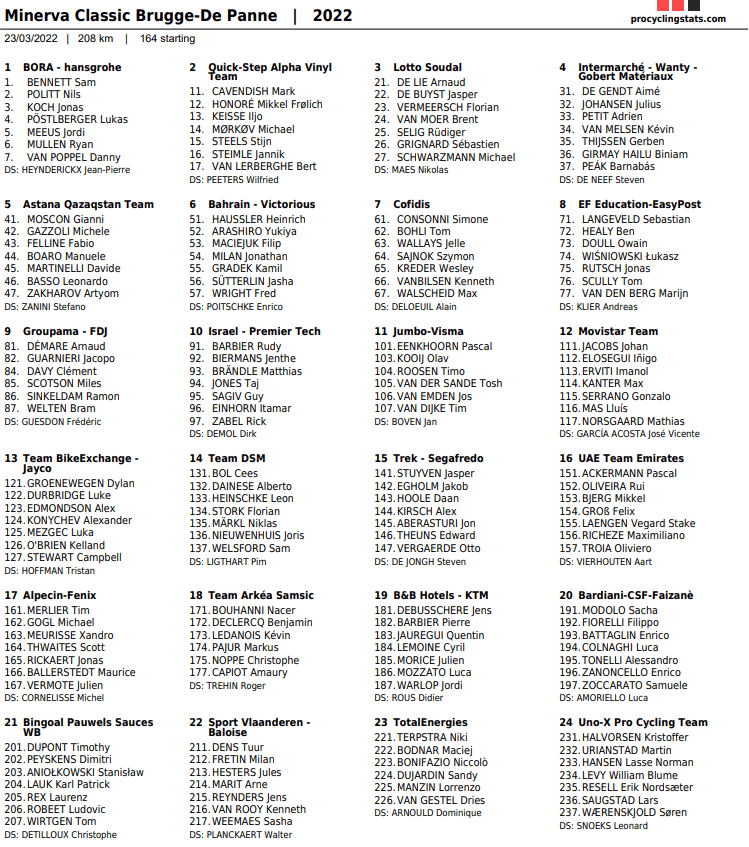 1 MERLIER 2 GROENEWEGEN 3 BOUHANNI … 4 WALSHEID 6 DEMARE 8 DE LIE 11 ANIOLKOWSKI 13 KANTER 14 DUPONT 17 BENNETT S 21 GIRMAY 22 VAN POPPEL D 27 MARIT 33 VAN GESTEL 37 REYNDERS 59 CAPIOT 60 WELTEN 68 MEURISSE 69 RIJCKAERT 74 WEEMAES 82 VAN MOER 83 KIRSCH 92 THEUNS 97 NOPPE 101 REX 116 WIRTGEN T 117 GRIGNARD 123 PETIT 136 ROBEET 137 VERMOTE J 143 PEAK 145 PEYSKENS … 10 ABANDONS pour une telle course, c’est peu.