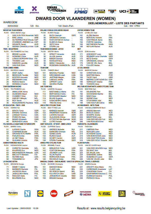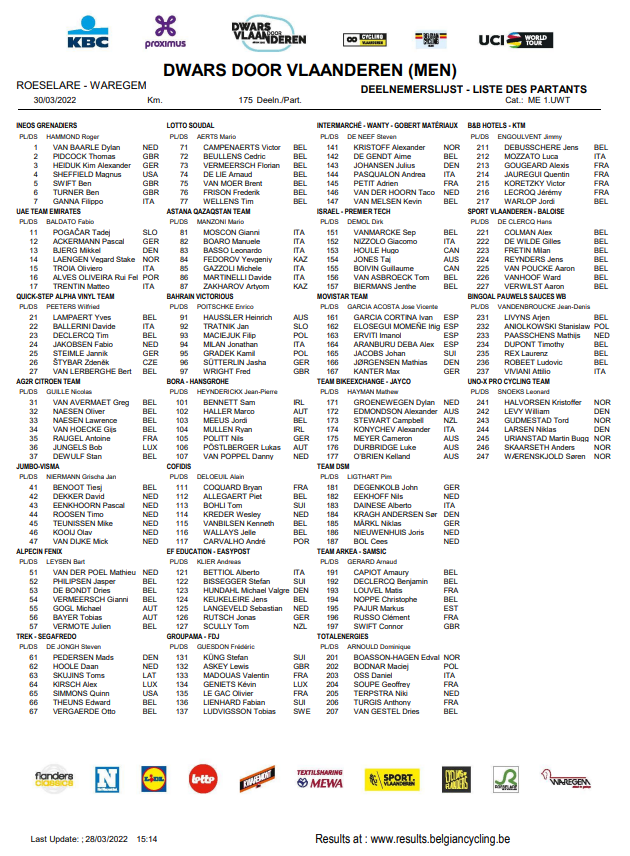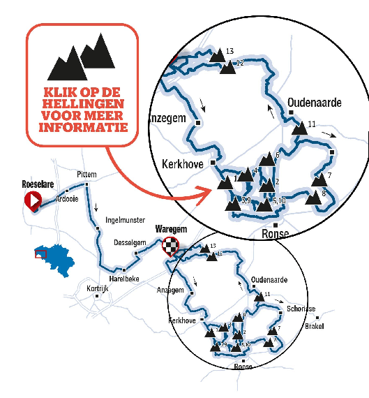Départ de ROULERS, arrivée à WAREGEM. 183,7 km. Dames et Messieurs sont en lice !!! Bien placé, vous pouvoir voir plusieurs passages dames et messieurs !!! Regardez le roadbook avec attention.
