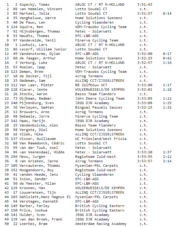 « WIELERFLIETS.NL » rapporte que c’est au sprint que le tchèque Tomas KOPECKY du team « ABLOC CT » a remporté le « WIM HENDRIKS TROFEE ». Une épreuve qui entre dans le cadre de la « U23 Road Série Open » et qui se déroulait aux Pays-Bas. Une localité bien connue de « LCOW ». Les deux « LOTTO » que sont Vincent VAN HEMELEN et Jelle HARTEEL terminent 2e et 3e. La cérémonie de clôture a permis de remettre les maillots distinctifs. Une vidéo se trouve sur la page FB de l’organisateur (de l’art). D’autres teams belges étaient en lice. Idem pour la « WOMEN CYCLING SERIE » (27/03).