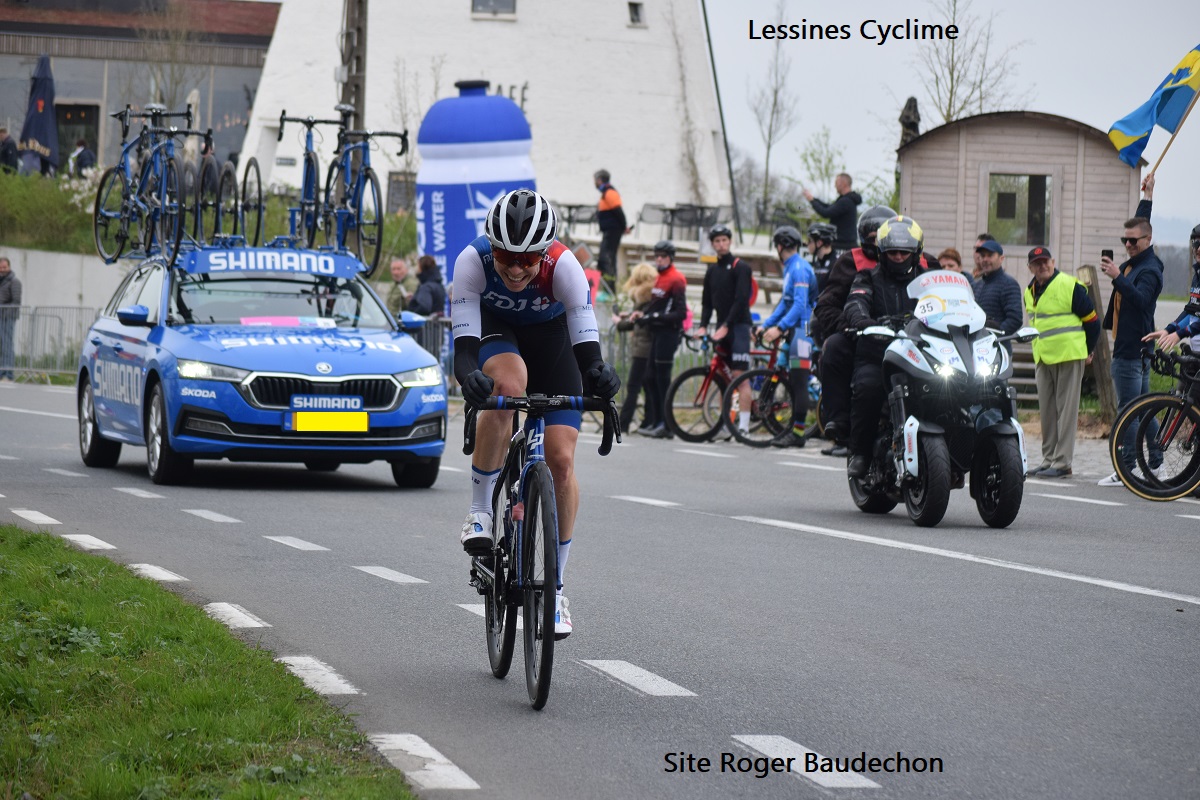 Photo. Une « française » du team « FDJ NOUVELLE AQUITAINE-FUTUROSCOPE » avait fait le trou !!! Elle prenait du plaisir car elle a fait signe à des comparses un peu plus bas et à notre hauteur, elle nous a gratifié d’un sourire. 👍