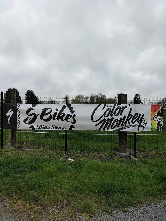 Photo. Tout se monte au terrain de jeu de balle du Chemin d’Enghien/Chée Gabrielle Richet. Et pour les réparations … un autre sponsor avec « S BIKE ».