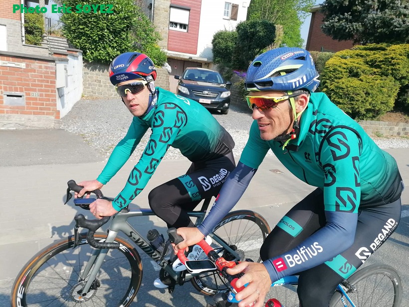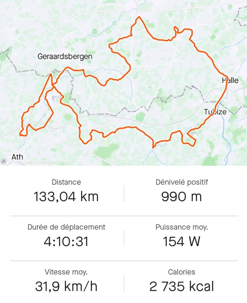 130 Km par un beau soleil. Le « TEAM THOMAS DEGAND » était de sortie dans la région de TUBIZE et HALLE. Un petit galop d’entrainement connaissant la résistance des rouleurs faisant partie du groupe. Look le look !!! Les tenues sont toujours disponibles. Passez par « DEGAND SPORT SOLUTION » pour vos achats. Etude de vos performances et programme adéquat … sont à la même adresse. En attendant, une chance que SergeD avait des jeunes dans le groupe … . (JérômeR semble lui avoir filé un coup de main 😉)