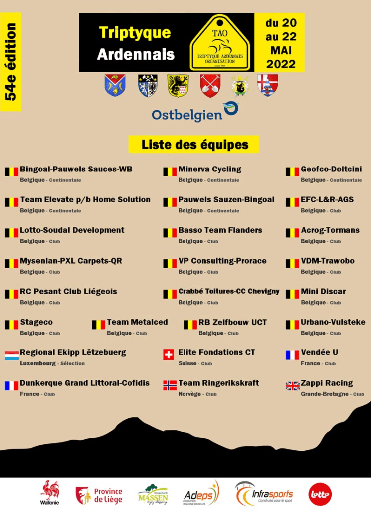 Le « TRIPTYQUE ARDENNAIS » débute ce 20 mai. Il se termine le 22 mai. Nous serons attentifs à l’évolution des étapes. Plusieurs teams connus sont en lice. Une belle, une dure, une plaisante. A suivre toute la semaine sur « DIRECT VELO ».