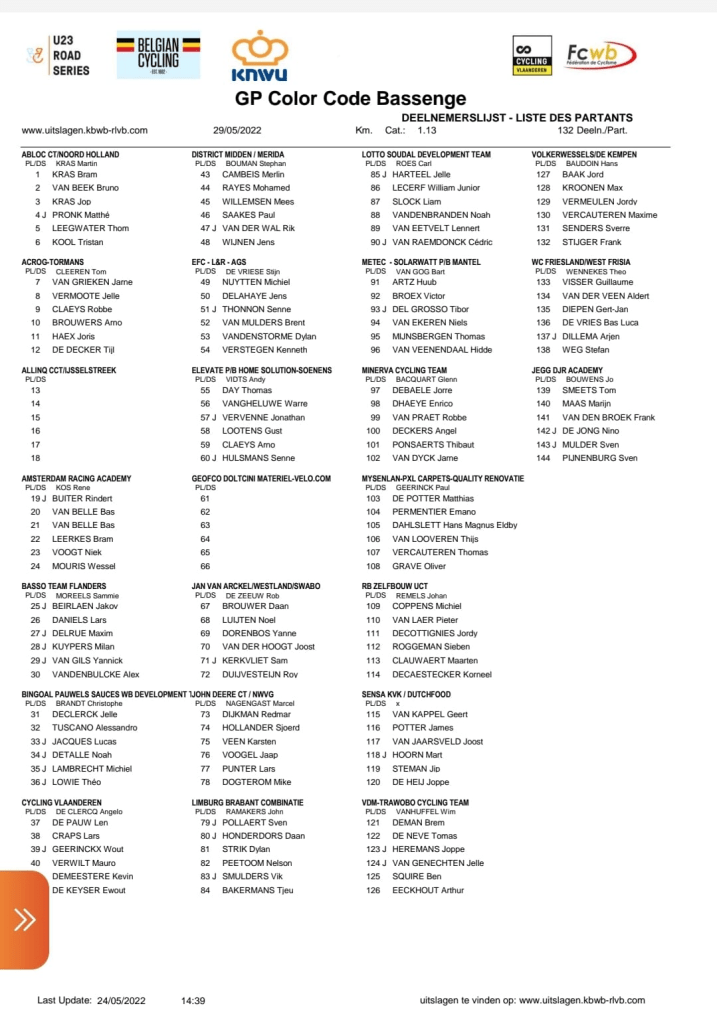 1 SLOCKE 2 VANDENSTORME 3 SMEETS … 8 VAN EETVELDE 11 DE CLERCK 12 DEGRAEF N 39 KESS 42 OMLOOP 45 LAMBRECHT 48 BONNET 50 HAEX 54 LOWIE 55 SQUIRE 61 DETHY M 64 DETALLE 75 HARTEEL …