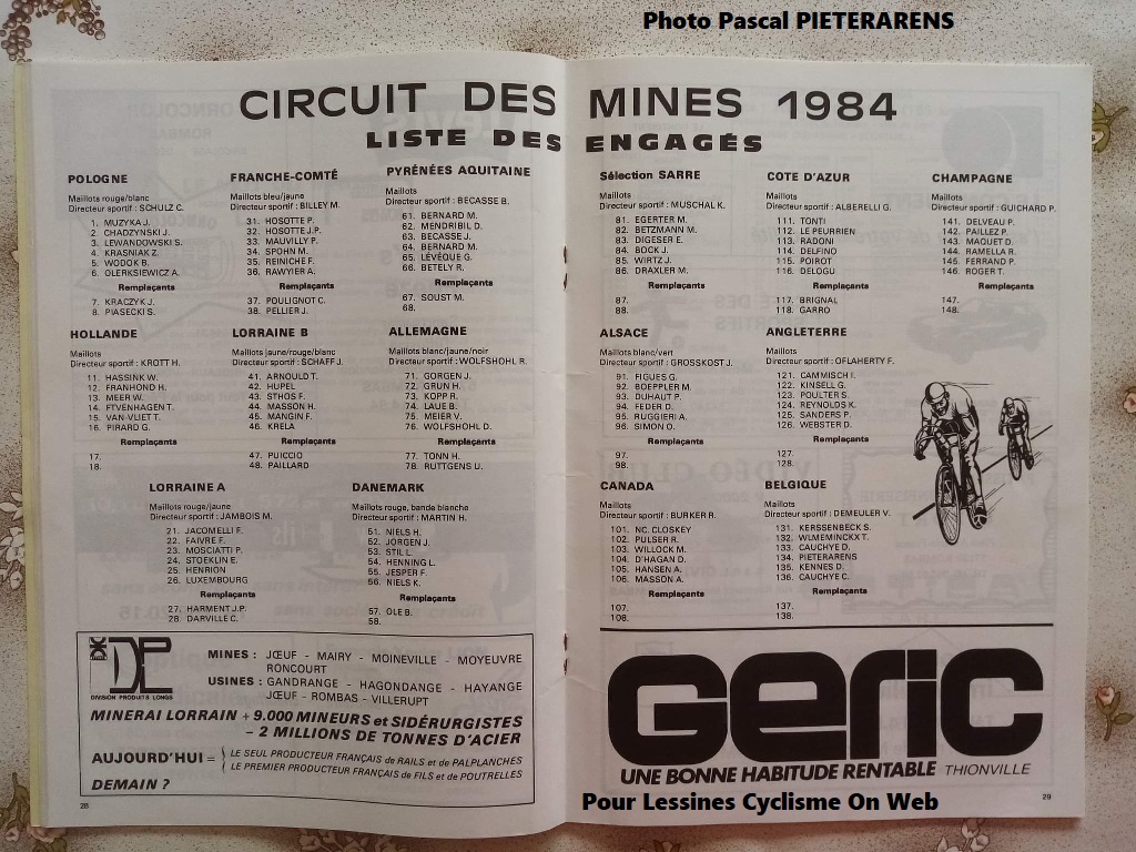 Quant à l’équipe belge de 1984, vous identifiez les coursiers. Ce sont les membres de la « PEDALE PETIT-ENGHIEN ». Avec comme DS, Mr Aimé DEMEULDER, le Président. Il n’est pas rare que des clubs soient invités sur des tours de cette catégorie. C’était aussi très habituel de prendre des renforts venant d’autres équipes pour compléter l’effectif. Lors de cette édition de 1984, c’est VAN VLIET qui l’emporte devant WEBSTER et KRAZNIAK. VAN VLIET avait remporté l’étape 4 – JOUEF-ROMBAS > 156 KM > 29/04/1984 – devant huit concurrents. Ils avaient pris plus de 3 min sur le dixième qui était Didier CAUCHIE. La messe était déjà dite. DEGLAS termine 46e, VLEMINCKX 50e, PIETERARENS 56e. (il y avait du changement par rapport au livret initial) Les autres équipiers n’étaient plus en course. La cinquième étape allait se jouer entre PIENNES et BRIEY le 01 mai 1984.