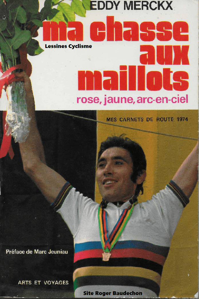 « EDDY MERCKX – MA CHASSE AUX MAILLOTS » (Mes carnets de route 1974) est publié aux « EDITIONS ARTS ET VOYAGES LUCIEN DEMEYER – BRUXELLES – GAMMA ». Année 1974. Il a été préfacé et rédigé par Eddy MERCKX avec Marc JEUNIAU et Pierre DEPRE. Imprimé en Belgique. 158 pages illustrées de photos en noir et blanc. (sauf la première qui est de « MIROIR DU CYCLISME ») « SPORT 70 » est propriétaire du contenu images. Coût en 1974 = 195 fb soit l’équivalent de +/- 5 € actuels. Il est disponible en seconde main. Le prix est nettement supérieur à celui de l’ouvrage neuf. Certains sites vendent le bouquin d’occasion à 20 € + le port … . L’édition originale (celle-ci) a été tirée à 5.000 exemplaires sur papier « vélin bouffant » (de la qualité d’un parchemin).