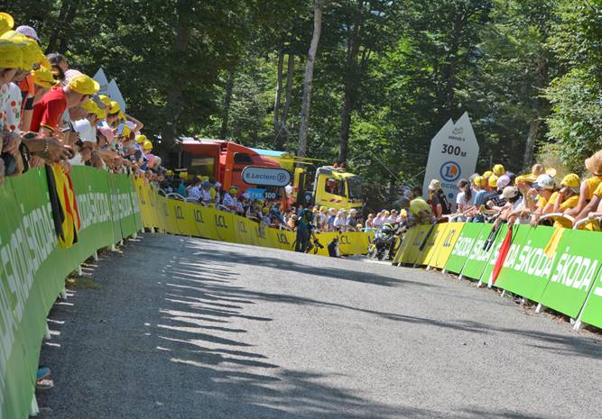 Le sommet est proche ; j’irai jeter un œil sur la ligne d’arrivée mais le site n’est pas encore opérationnel; des spectateurs s’y trouvent déjà en masse. Ils avoueront avoir dormi sur place ! Il n’est pas encore midi et l’arrivée est prévue vers 17h30 !!