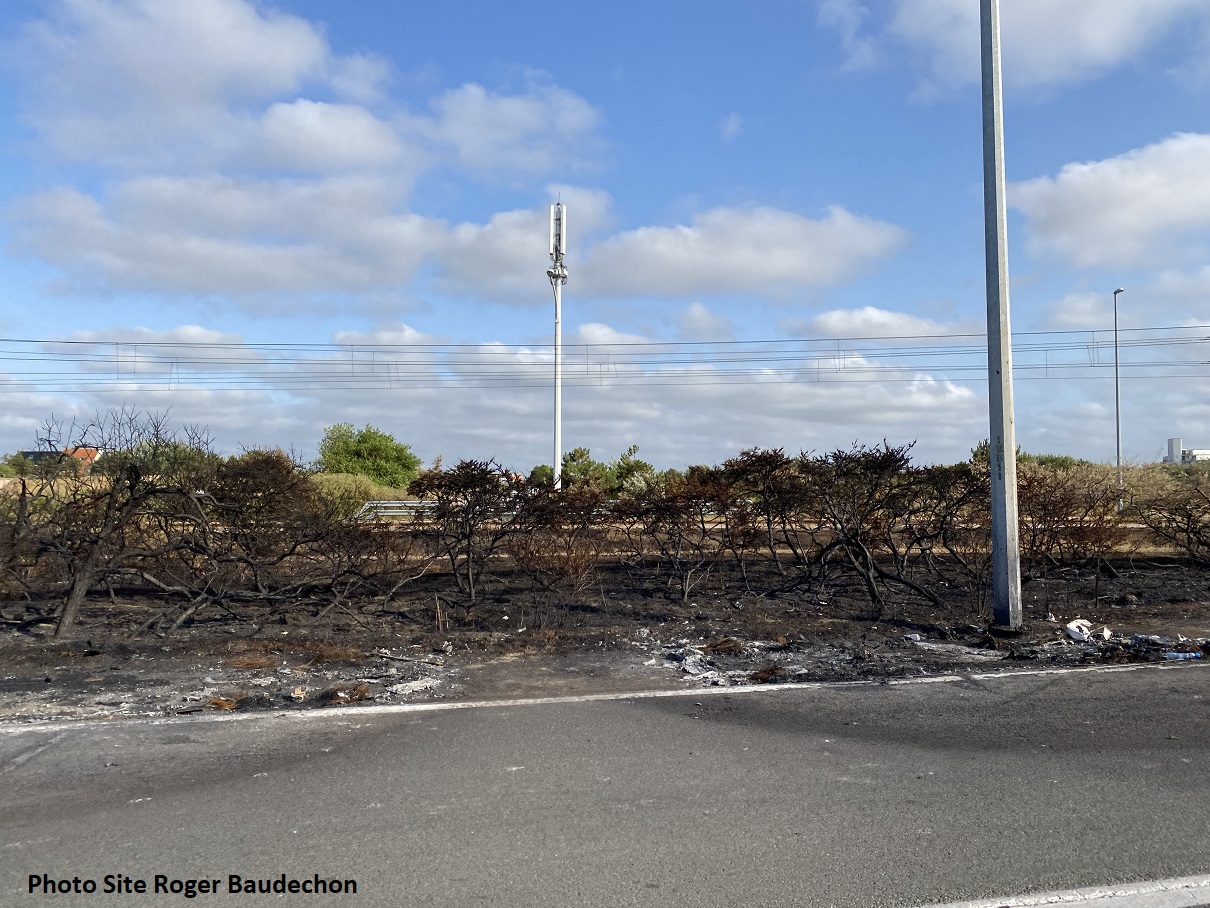 De passage ce jeudi soir sur la deux fois deux bandes entre LE COQ et BREDENE, une voie de circulation est toujours fermée. Les plantations sont calcinées. Du côté des DUNES, c’est contenu. L’espace incendié par un véhicule n’est pas très grand. Les pompiers ont très bien limité les dégâts potentiels. #RareALaMer