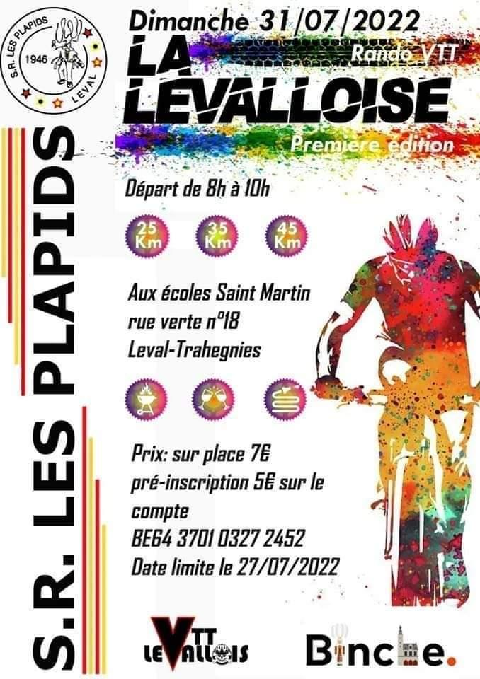 Une première organisation pour les « PLAPIDS » (patois=pieds plats ) de LEVAL-TRAHEGNIES. (entité de Binche) 25-35-45 km. Dernier jour pour profiter de 2 € de réduction sur l’inscription. Barbecue, bar et bike wash à disposition. Une contrée qui vaut le détour. Merci à DavidL