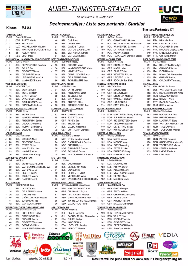 Voilà une épreuve pour les juniors qui est bien compliquée. C’est le 05-06-07 août que se déroulent les trois étapes. Et pas des minces … . PAJUR, le costaud qui a logé à Bois-de-Lessines et gagné à Flobecq est présent. WERTZ, PRESTIANNI, SENTJENS, VERBRUGGHE, CHAMBERLAIN, BROECKAERT, VAN PETEGEM M, PLACE, ISIDORE, … sont là. Une épreuve suivie par les managers des teams pros.