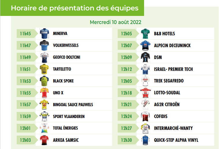 Le plus gros des informations se trouve dans un post daté du 29 juillet. Voici pour le surplus l’ordre de passage des équipes (présentation) et la liste des partants.