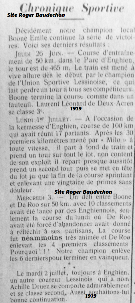 Par ailleurs, nous pouvons aussi lire que Léonard LAURENT (Acren, papa de Jean), Emile BOONE (Lessines, commerce de cycles au Pont d’Ancre) et Achille DRUEZ (Lessines, papa de Victor) étaient bien des vedettes de l’époque.
