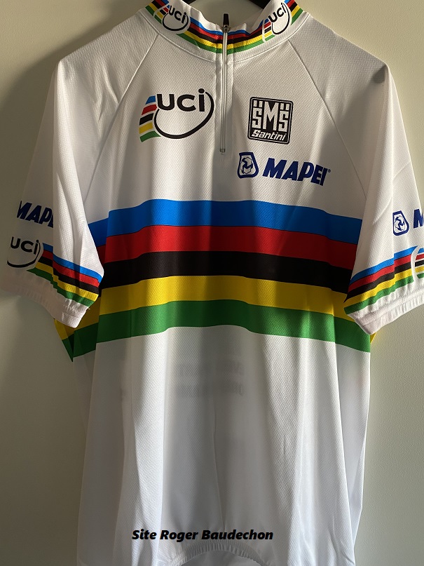 Merci à MichelG pour ce maillot de « CHAMPION DU MONDE » à l’effigie de « MAPEI » qui était sponsor principal des « CM » en 2021. (Belgique) « MAPEI » un nom qui ne s’oublie pas. L’entreprise qui vend des produits du bâtiment a été présente comme sponsor principal d’un team de 1993 à 2002. Des coureurs comme MUSEEUW, BARTOLI, OLANO, VANDENBROUCKE F, ROMINGER, TAFI, BUGNO, BALLERINI, … ont porté ses couleurs. Depuis, elle reste partenaire à certaines occasions. (84 usines sur 5 continents, 32 centres R/D dans 20 pays)