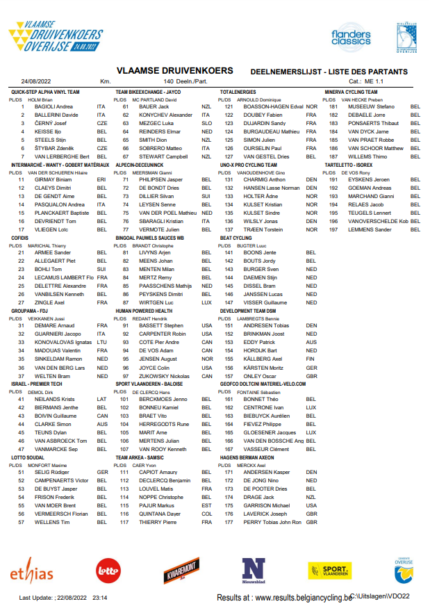 Le titre originel est : « VLAAMSE DRUIVENKOERS OVERIJSE ». L’épreuve aura lieu ce mercredi 24 août 2022 à OVERIJSE. Merci à PascalPIT de nous rappeler que OVERIJSE s’intercale entre toutes celles qui vont arriver. La fin du mois d’août et le début du mois de septembre seront animés. « LCOW » ne devrait pas être sur place (en principe). De grosses chaleurs sont attendues. Le panel des équipes participantes vaudra le détour … . « GEOFCO-DOLTCINI-MATERIEL VELO.COM » va affronter de gros morceaux.