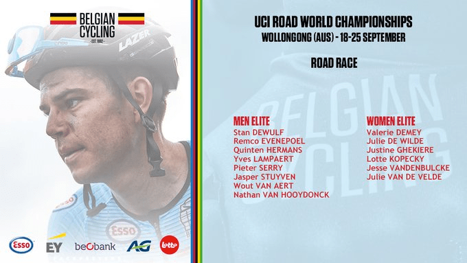 - La sélection belge pour les mondiaux est ambiguë. EVENEPOEL et VAN AERT en leaders. C’est avoir deux coqs qui vont se tirer dans les pattes. Souvenez-vous de Louvain. STUYVEN, HERMANS Q, LAMPAERT, SERRY, VAN HOOYDONCK, DEWULF. Rés : VAN AVERMAET, PHILIPSEN, VAN GESTEL, VERVAECKE. Les équipiers présents nous démontrent que les clans sont constitués.