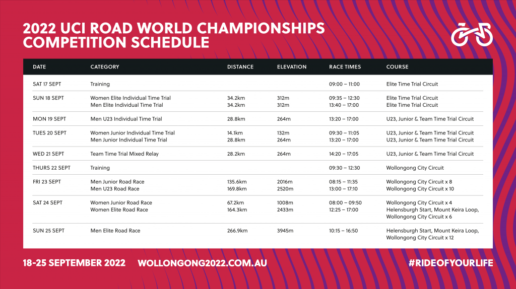 Nous allons bientôt entrer dans une semaine cruciale pour toutes les nations. En effet, c’est ce dimanche que débutent les « CHAMPIONNATS DU MONDE » de CYCLISME sur ROUTE. Voici quelques informations. L’AUSTRALIE est à l’autre bout de la planète. Les retransmissions seront données entre 02h00 et 07h00 + prolongements. Il va falloir se lever tôt ou ne pas dormir pour suivre les compétitions !!!