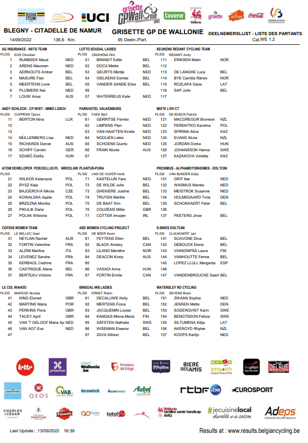 Le « GP DE WALLONIE » messieurs et le « GRISETTE GP » dames ont lieu ce mercredi 14/09/2022. Une journée complète qui s’annonce sous la pluie. Deux pelotons bien fournis nous attendent entre BLEGNY et NAMUR.