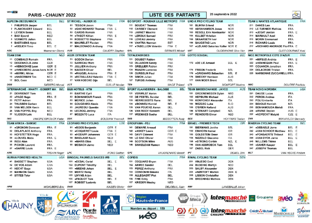 1 CONSONNI 2 GROENEWEGEN 3 TESSON … 5 DE LIE 8 MOZZATO 12 COQUARD 15 VAN ROOY 16 PAGE 18 MERTZ 25 VAN ASBROECK 42 PHILIPSEN 44 DESAL 47 FRISON 48 MEENS 51 VAN MOER 54 PETIT 81 PAQUOT 100 LIVYNS 110 DUPONT 114 THIJSSEN 123 VLIEGEN 137 SAEVER …
