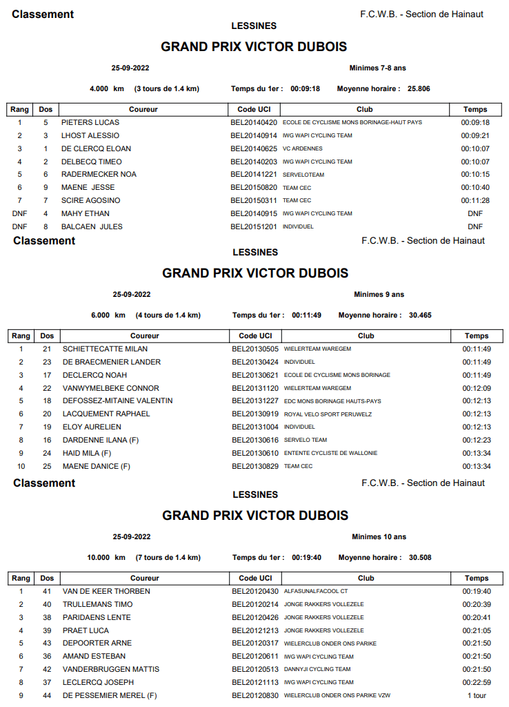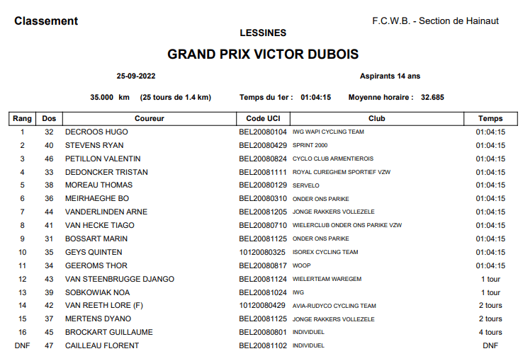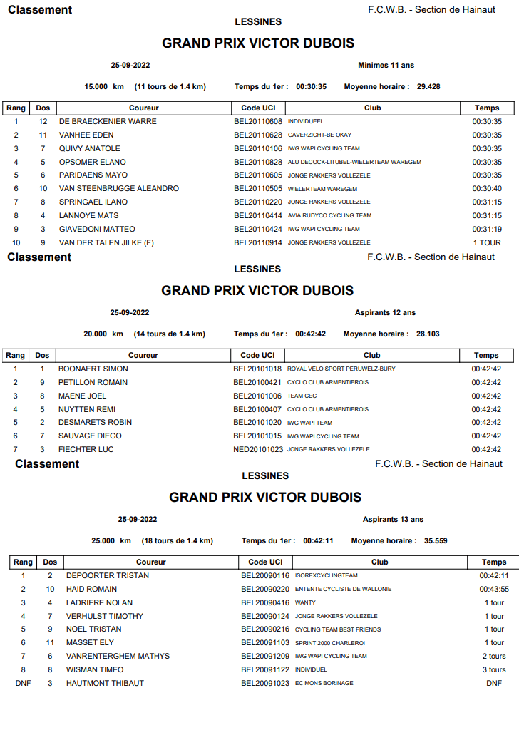 RESULTATS – HOURAING – MIN/ASP. #2 #25/09 #2022 27 septembre 2022 par DU CYCLISME POUR TOUS, publié dans Archives 2022 Photo. Un beau podium. Voici les résultats des épreuves qui se sont déroulées à HOURAING/LESSINES : Partager : Partager sur X(ouvre dans une nouvelle fenêtre) X Plus Partager sur Facebook(ouvre dans une nouvelle fenêtre) Facebook J’aime chargement… Publié par DU CYCLISME POUR TOUS Une petite équipe toujours active en matière de cyclisme. LOISIRS-COMPETITIONS-CYCLOS-MATOS-RANDOS-CIRCUITS-ARCHIVES. LCOW/SITE Roger Baudechon Voir tous les articles par DU CYCLISME POUR TOUS