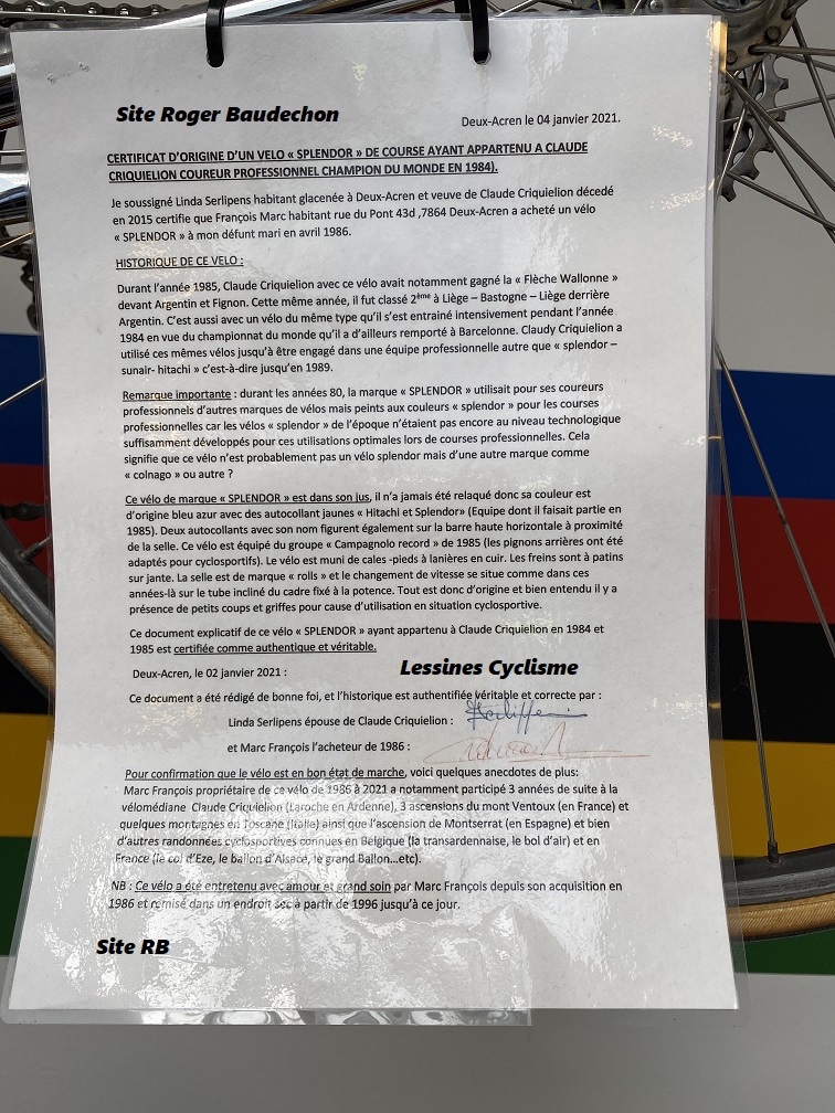 Lors du dernier gala de boxe, un vélo ayant appartenu au « CRIQ » avait pris place dans le Club House de la salle de sport lessinoise. Il était accompagné d’un « certificat d’origine ». A ce jour, nous ne savons pas si l’engin est encore présent dans ce local. #BeauMatosVintage #CriquielionClaudy