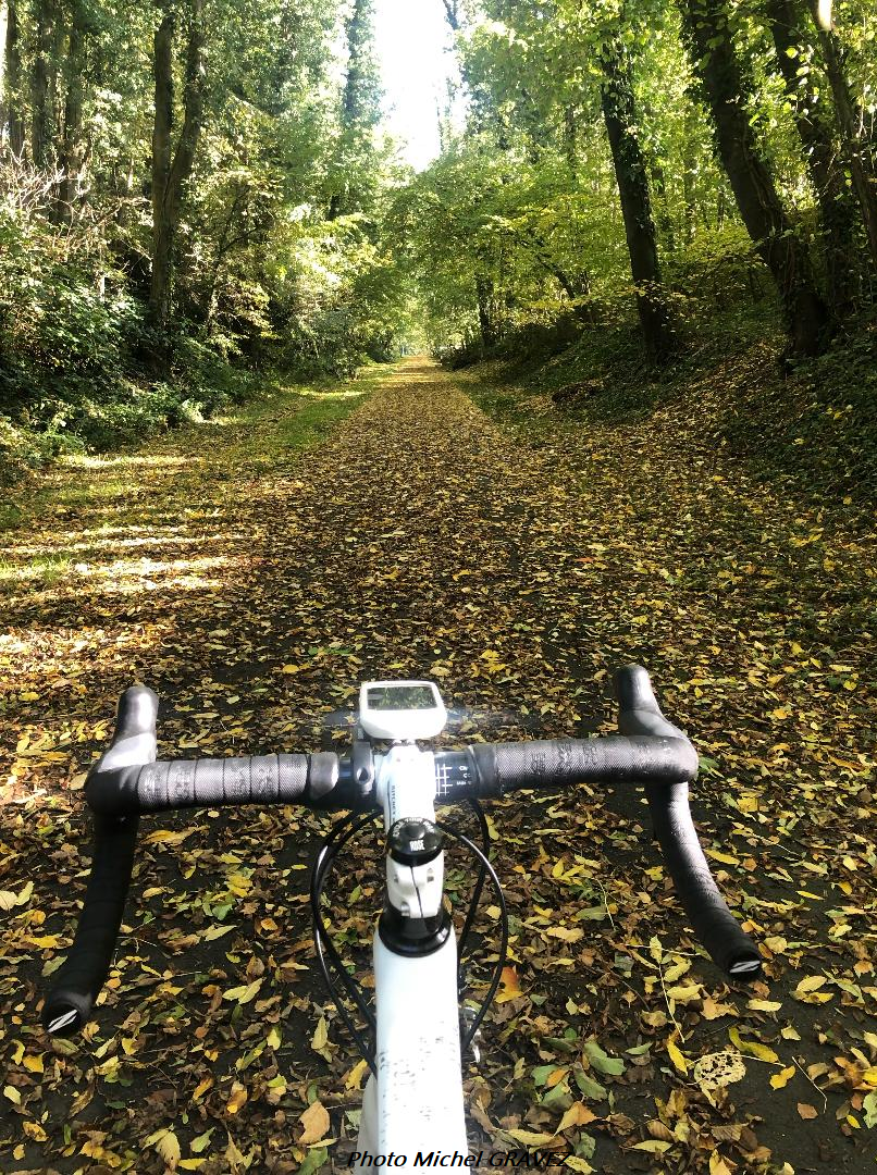 Le « RAVEL » LESSINES-FLOBECQ est recouvert de feuilles mortes. (Classiques : « Tour de Lombardie » – « Paris-Tours ») L’automne frappe à notre porte. #Dangers #Luminosité #Coloris #AVosVélos