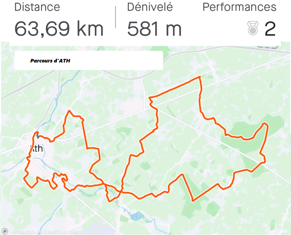 Dimanche dernier, les AMICALES des POLICIERS et des POMPIERS de ATH/LESSINES organisaient leur première « BALADE VTT ». Rendez-vous était fixé au « HALL CEVA ». Départ possible entre 08h et 11h. Les participants avaient le choix entre les distances suivantes : 23 et 63 km. Il y avait également de la MARCHE. DavidL nous informe que tout était « TOP ». Toutefois, la météo matinale a dégénéré à l’approche de midi. Pluie, vent, fraîcheur et donc boue, ont rendu les choses plus compliquées que prévu. Surtout dans les 15 derniers km. La fatigue se faisait sentir. Par contre, beaucoup de vététistes avaient fait le déplacement. Un bon début !!! Bravo aux initiateurs. 🥇(week-end des amicales de secours)