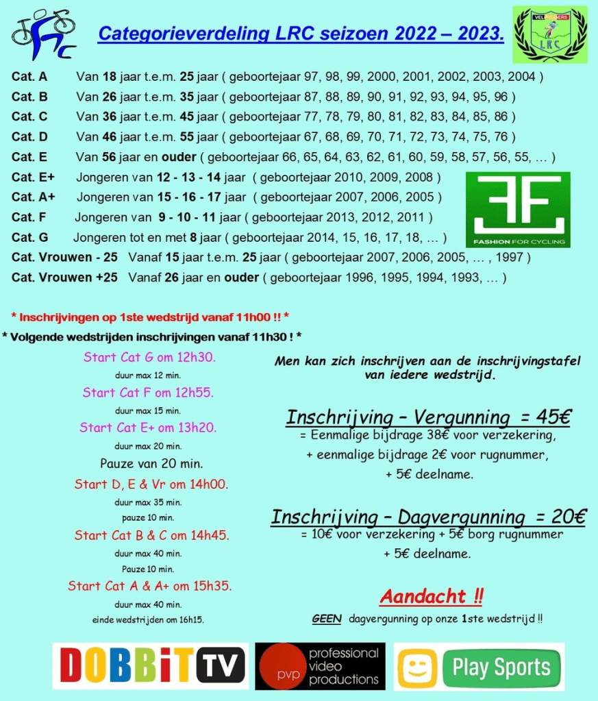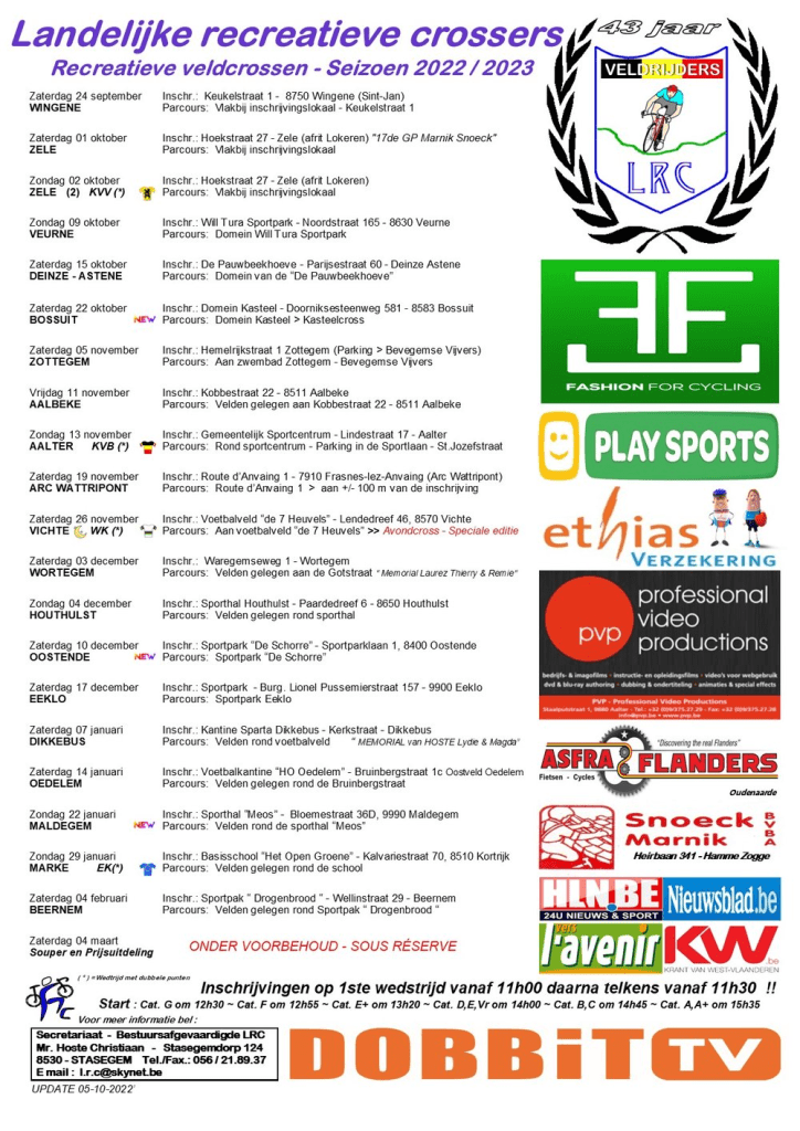 La « LANDELIJKE RECREATIVE CROSSERS » a programmé le CYCLOCROSS de ARC-WATTRIPONT (Frasnes) en date du 19/11/2022. Soit, ce samedi. « LCOW » sera sur place pour quelques épreuves. Début à 12h30 et fin vers +/-17h00. Il y a de fortes chances que de nombreux régionaux seront dans les pâturages. ARC- WATTRIPONT est un village situé en pleine campagne. Le parking n’est pas aisé mais l’accueil dans la « MAISON DE VILLAGE » est parfait. Tous au poste !!! Enormément de compétiteurs en lice !!!