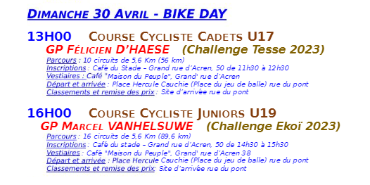 Le programme 2023 de « L’ENTENTE CYCLISTE ACRENOISE« est annonciateur d’un « BIKE DAY » qui mettra en lice les DEBUTANTS et les JUNIORS. Notez la date : 30 AVRIL. Pour rappel, la dernière édition avait rassemblé 108 et 74 partants. Prions Saint-Vélo pour que la prochaine mouture soit identique !!!