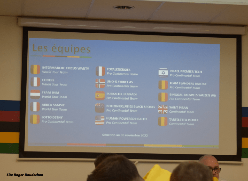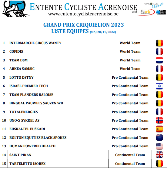 Lors de la conférence de presse de mercredi dernier, les organisateurs ont donné une pré-liste du prochain « GP CRIQUIELION » (2023). Il y a encore énormément à venir comme le signalait Laurent HAEGEMAN, Président de « L’ENTENTE CYCLISTE ACRENOISE ». « Le téléphone ne cesse de sonner ». Il est manifeste qu’il y aura (un peu) moins de CONTINENTALES. Quant aux CLUBS … . Le Règlement UCI est certainement précis en la matière comme c’est le cas des 1.2.