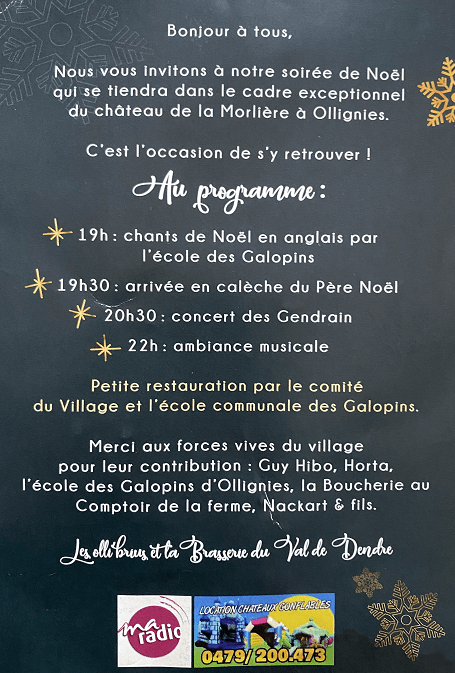 DavidL, toute l’équipe des « OLLI’BRIUS » et la « BRASSERIE DU VAL DE DENDRE » sont ACTIFS !!! La grande soirée au château d’Ollignies, c’est ce soir. La foule est attendue. 🎄