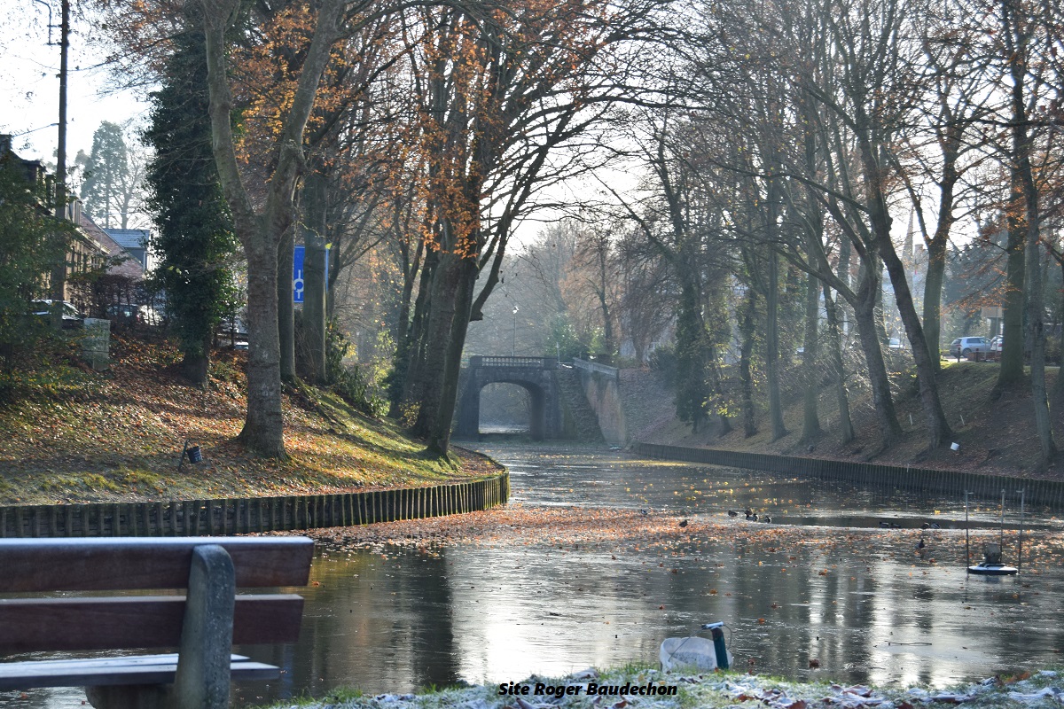 Une petite pellicule de glace est visible sur l’étang formé par le bras d’eau venant du Château d’Enghien. Pas encore de quoi faire du patin mais … . #AVosVélos
