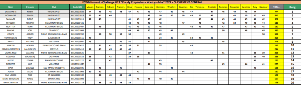 Pour le classement complet, orientez-vous vers le site web de la « FCWB-HAINAUT ».