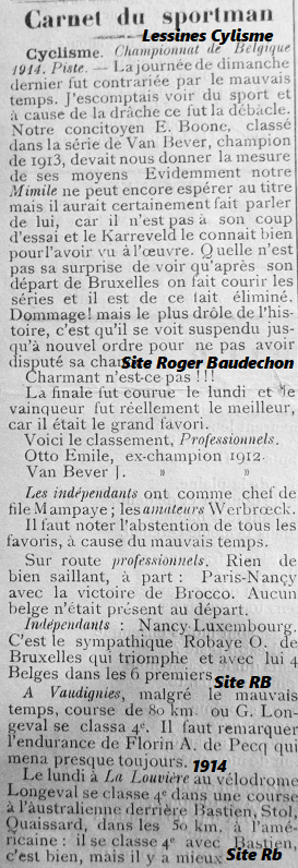 Le 28 juin. L’assassinat de l’Archiduc François-Ferdinand a servi de détonateur (Sarajevo). Le 28 juillet. L’Autriche-Hongrie attaque la Serbie. Tout allait s’enchainer. Pourtant, les « CHAMPIONNATS DE BELGIQUE » sur piste ont lieu au « KARREVELD » (Molenbeek). Ce vélodrome a été ouvert en 1908 après la disparition de celui du Bois de la Cambre. Il aurait fermé ses portes en 1916. Dans l’article, vous disposez d’autres épreuves. VAUDIGNIES – LA LOUVIÈRE … .