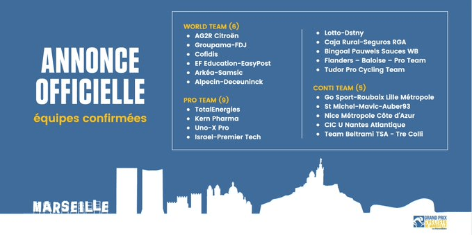 Le « GP LA MARSEILLAISE » va nous réserver un beau spectacle. Le 29 JANVIER, c’est sur « FR 3 » PACA , « EUROSPORT » … et sur le net que nous pourrons suivre l’événement. A moins d’être sur place. 167,9 km attendent les coursiers. Départ : 12h15. Qui sera le successeur de Amaury CAPIOT ??? (absent sur cette édition)