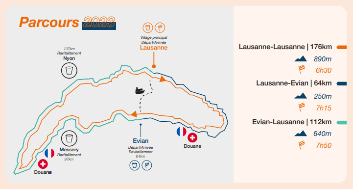 Distances : 176 km >>> 890 D+ (Dép : 06h30) – le tour du lac. 112 KM >>> 640 D+ (Dép : 07h50) et 64 km >>> (Dép : 07h15).
