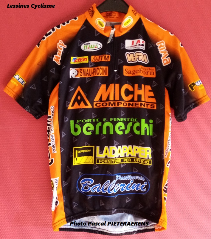 Il s’agit du maillot de l’équipe « MICHE » (Bulgarie) datant de 2003. Team qui a connu beaucoup de mutations durant la saison. Toutefois, il a existé dix ans avec d’autres sponsors. « MICHE » a encore fait quelques apparitions par la suite. En 2003, 31 coureurs composaient l’effectif : BORGHESI, GRECHYN, PETROV, STORO, TACCONI, … et Glen ZELDERLOO (Bel) a qui appartenait ce maillot en entête. ZELDERLOO (43 ans) est natif de Asse. Il a été pro – un an – chez « JARTAZI-GRANVILLE » (2004 avec VANENDERT). Ses meilleurs résultats furent certainement 2e et 3e de « OHN » chez les ESPOIRS/EL-SC.
