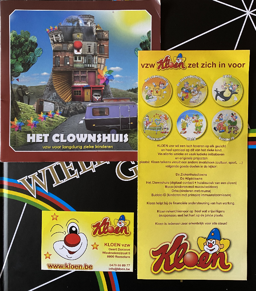 Nous rappelons que le produit de la vente est destiné à l’ASBL KLOEN de Roulers (coordonnées ci-dessous). L’ouvrage est cartonné. Les 112 pages sont confectionnées dans un papier glacé de très bonne qualité. Les auteurs sont : Dimitri CARPENTIER (écriture), Filip CARDOEN (caricatures) et Nico TOYE (collectionneur). 2022. Notez que ce bouquin reprend une « EXPO » du même nom qui s’est tenue au « CENTRUM RONDE VAN VLAANDEREN » à Audenarde (2021). « KOERSMUSEUM » et « CRVV » ont collaboré pour les accessoires qui servent à la mise en page. Michel WUYTS, commentateur très connu de « SPORZA », a rédigé le préambule. La publication est déposée et possède un numéro ISBN. © Droits réservés Il ne comporte pas les mentions relatives à l’imprimeur ou à une maison d’édition.
