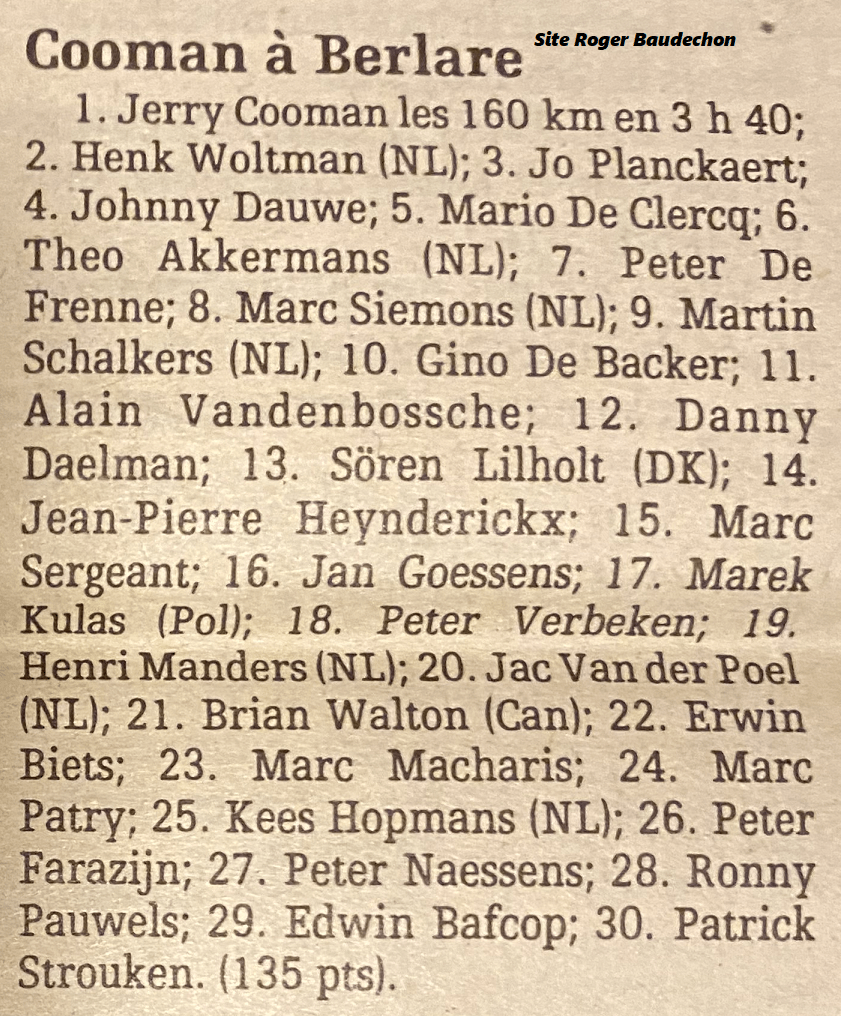 Dans ce classement d’une kermesse pour professionnels de 1991, nous remarquons la présence de : Jo PLANCKAERT (3e), Mario DE CLERCQ (5e), Alain VANDENBOSSCHE (11e), Soren LILHOLT (13e), Marc SERGEANT (16e), Marc PATRY (24e), … . (135 partants)