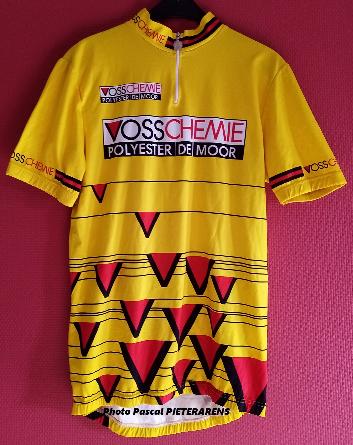Voici le maillot du médaillé de bronze des JEUX OLYMPIQUES de 1992 à BARCELONE (piste). Cédric MATHY (53 ans) natif de Ixelles était un coursier qui a roulé pour « VOSSCHEMIE » et variantes en 1993 et 1994. 15 fois Champion National sur piste, il a fait quelques apparitions sur la route. Il a habité à Lessines durant les années 2000.