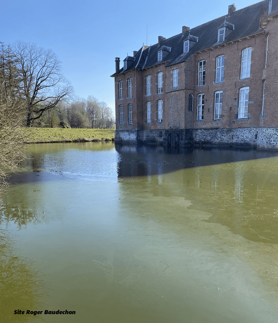Il a bien gelé ces derniers jours. La glace est visible au niveau des douves du château de Bois-de-Lessines. #AVosVélos