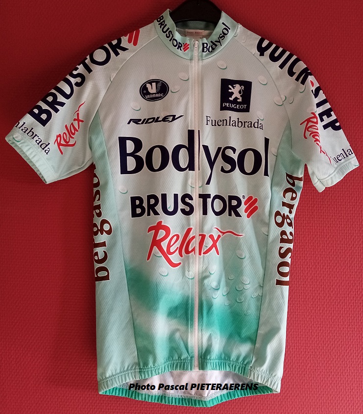 Ce maillot de l’équipe « RELAX-BODYSOL » date de 2004. Il a appartenu à Bart DOCKX. Le team était espagnol mais des belges comme : DOCKX, DEVOCHT, MATTAN, PAUWELS, ROESEMS, ROSSELEER, VAN HECKE, VANLANDSCHOOT ou encore VAN SUMMEREN en faisaient partie. Cette année-là, Bert ROESEMS avait cassé la baraque. Quant à DOCKX, il passa chez « LOTTO » et ses nombreuses variantes jusqu’en 2009. Il prendra ensuite la direction de « LANDBOUWKREDIET » jusqu’en 2011. Il a participé à cinq grands tours dont quatre Vuelta et un Giro. Il remportera la « FLÈCHE FLAMANDE ».