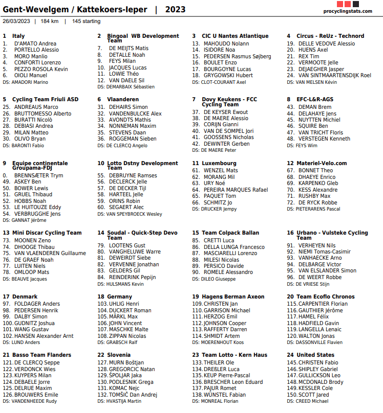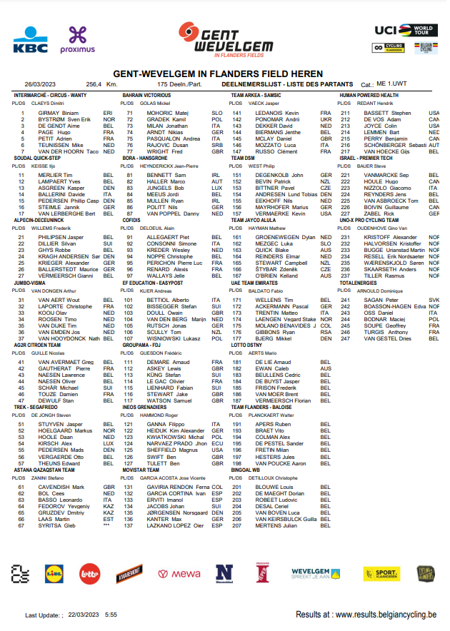 Dames et Messieurs ont rendez-vous à « GAND-WEVELGEM ». Mais aussi les JUNIORS (« GP NOYELLE ») et les ESPOIRS (« KATTEKOERS »). Ce dimanche, 26 mars, la course du souvenir (guerre 14-18) sera la dernière de la trilogie « WT » de la semaine. « GAND-WEVELGEM » et ses routes d’un autre âge a quelques chose de plus. Il faut aussi beaucoup de chance pour remporter cette classique (chute, casse, fuite, …) JhonnS y était allé il y a quelques années. Il avait été impressionné.