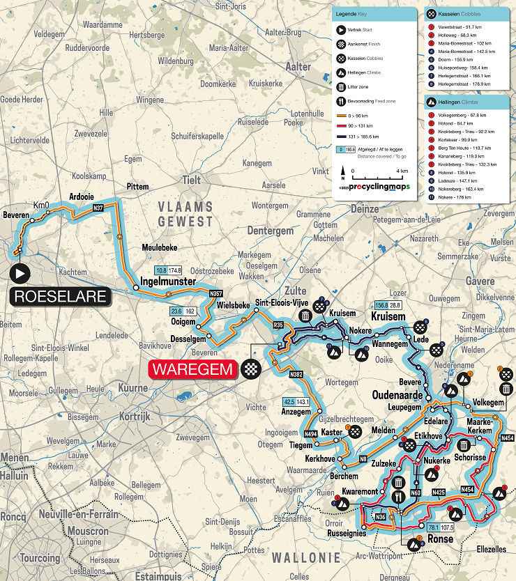 12h05, départ de la Place de la Station à Roulers. Présentation des équipes au préalable. 14h45, pour les dames mais à l’Hippodrome de Waregem.