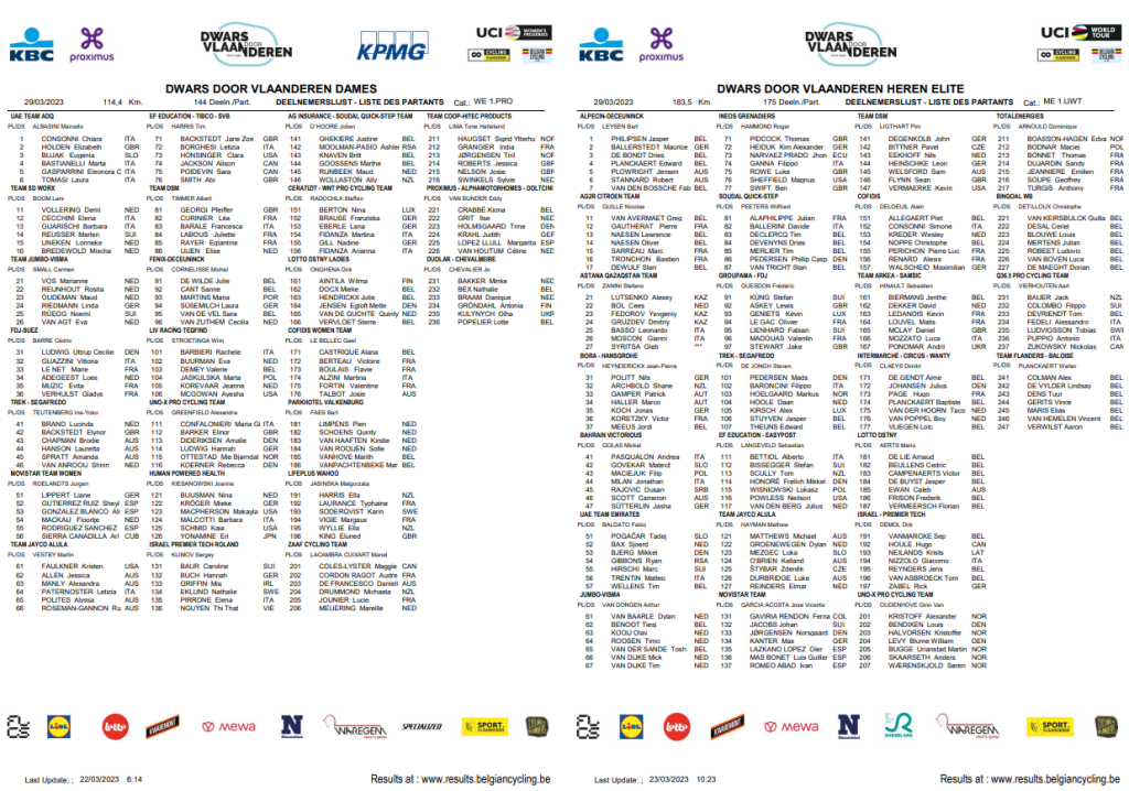 Un redoux est annoncé pour mercredi. C’est une chance. Les sportifs ainsi que les spectateurs ont été bien rincés la semaine dernière. Avec « DVV », c’est une nouvelle « WT » qui frappe à notre porte. Dames et Messieurs seront en lice. Une répétition avant le grand « RONDE ». Pour sûr, en ce moment, il y a des costauds mais aussi des absents. Des teams en vue et d’autres qui passent à côté de leurs premières classiques. Avec « A TRAVERS LA FLANDRE », un nouveau chapitre s’ouvre. Qui va succéder à VAN DER POEL dans le palmarès déjà très étoffé ?