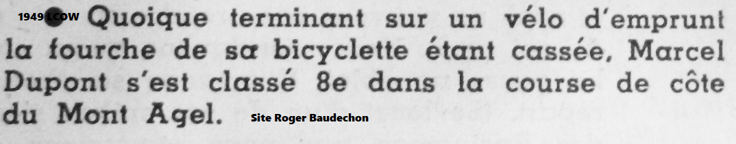 C’est par ces termes que l’article débute : « Quoique terminant sur un vélo d’emprunt, la fourche de sa bicyclette étant cassée, … « . Marcel DUPONT natif de Jupille-Sur-Meuse, est décédé en 2008 à Gilly, à l’âge de 90 ans. Professionnel de 1940 à 1953, ce baroudeur a fréquenté de gros teams comme : « ALCYON » ou « GUERRA ». Il a un palmarès éloquent. Vous remarquerez qu’il termine 8e de la course de côte du MONT AGEL (Fr). La « NICE-MONT AGEL », est une épreuve de 38,6 km. Le 15 mars 1949, c’est LAZARIDES qui l’emporte devant DE GRIBALDY et DOTTO. DUPONT Marcel est pointé à 2 min 59 sec du vainqueur qui avait bouclé le périple en 01h 19 min 56 sec. Le belge connaitra probablement sa plus grande consécration lors de « ROUBAIX-HUY » en 1950 (01-02/07/1950). Il laisse dans son sillage Robert NOLF, Henri VAN KERKHOVE, Roger DESMET ou encore Albert VAN HERZELE. 1er de « SPA-REMOUCHAMP », 4e d’un « TOUR DE L’OUEST » et 5e d’un « TOUR DE FRANCE », cela marque aussi une carrière !!! (Un « SOUVENEZ-VOUS » est sur site)