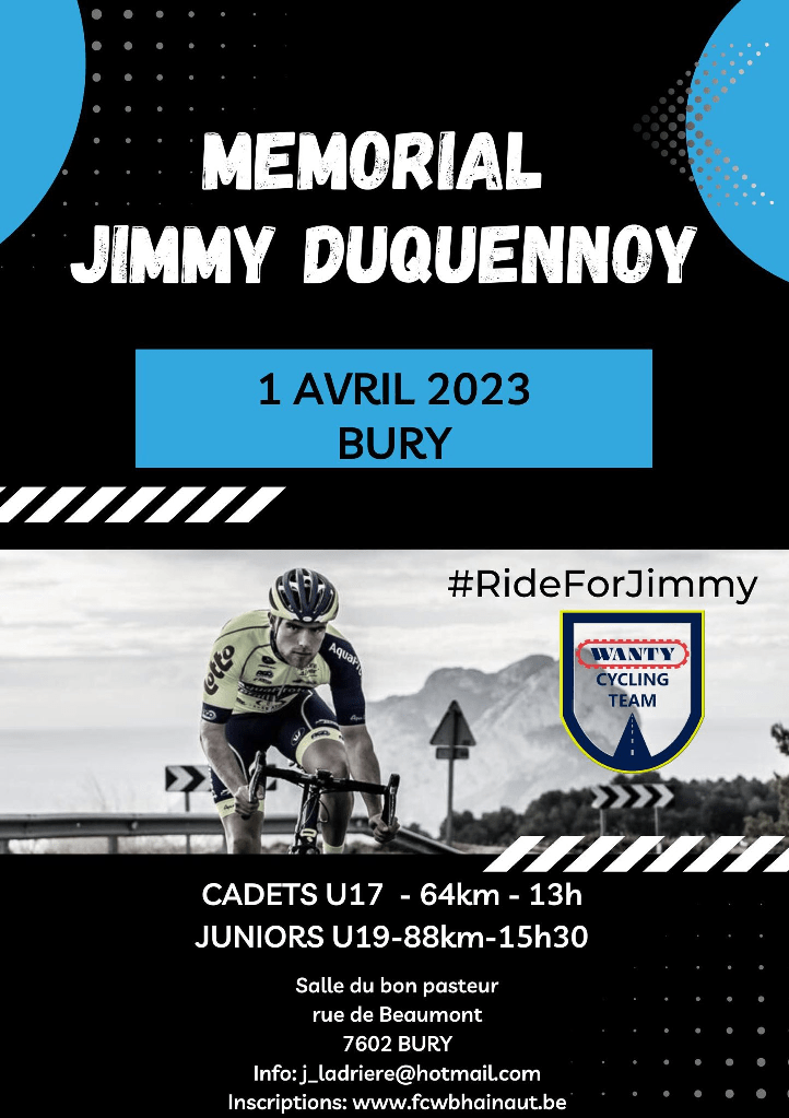 Ce 01 avril 2023, c’est la journée du souvenir. Le « MÉMORIAL JIMMY DUQUENNOY » consacré aux DÉBUTANTS et JUNIORS aura lieu à BURY. Une organisation du « WANTY CYCLING TEAM ».