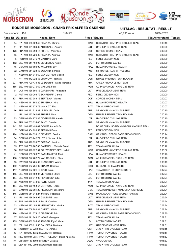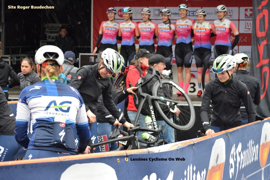 Elles étaient 155 à retirer le dossard. Notons la présence d’une trentaine de dames qui venaient de terminer « PARIS-ROUBAIX ». L’une d’elles : Marion BORRAS « SAINT-MICHEL/MAVIC/AUBERT93 » avait été classée 5e. Voir un tel nombre de participantes sur un départ, c’est toujours impressionnant. Plusieurs « WT » étaient inscrites. Quelques effectifs avaient été complétés avec des « develop ». Le calendrier est serré. Et avec les malades ou les chutes, il faut pouvoir aligner un minimum de membres. De suite, nous avons compris que « FENIX-DECEUNINCK », « CERATIZIT-WNT », « UNO-X », « JUMBO-VISMA », « SAINT-MICHEL », « JAYCO », « HUMAN POWERED », « AG INSURANCE-NXTG » ou encore « COFIDIS » venaient pour la gagne. Premier tour et déjà plus de la moitié de la troupe était lâchée. La pluie, les routes détrempées et glissantes font des dégâts. Les moins téméraires ne prennent pas de risques. Les chutes sont nombreuses. De petits chemins venteux causent des bordures. Et dire qu’il a plu quasiment tout l’après-midi !!! Mi-course et le compte est vite fait. Il n’y a plus que la moitié du peloton initial. Il y a deux groupes. Dans les derniers tours, l’élagage continue. Elles seront une trentaine pour tenter de remporter le bouquet 1.1. Il y a des tentatives d’échappées jusque dans les derniers kilomètres. CAMPBELL ou DE VRIES veulent éviter le sprint. Finalement, les « UNO-X » mettent le paquet pour AHTOSALO mais elle se fait déborder par les sœurs FIDANZA. Arianna lance Marina qui remporte la « RONDE DE MOUSCRON » devant AHTOSALO et FORTIN. Sur place ou devant la TV (NOTELE-TIPIK) la course fut rondement menée. Bravo à toutes et à tous !!!